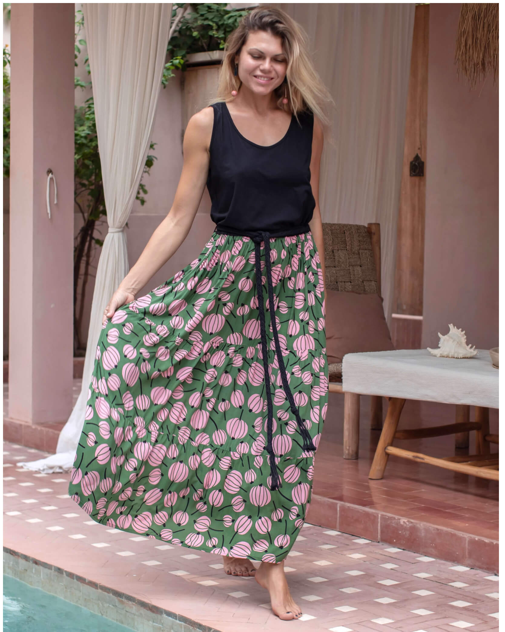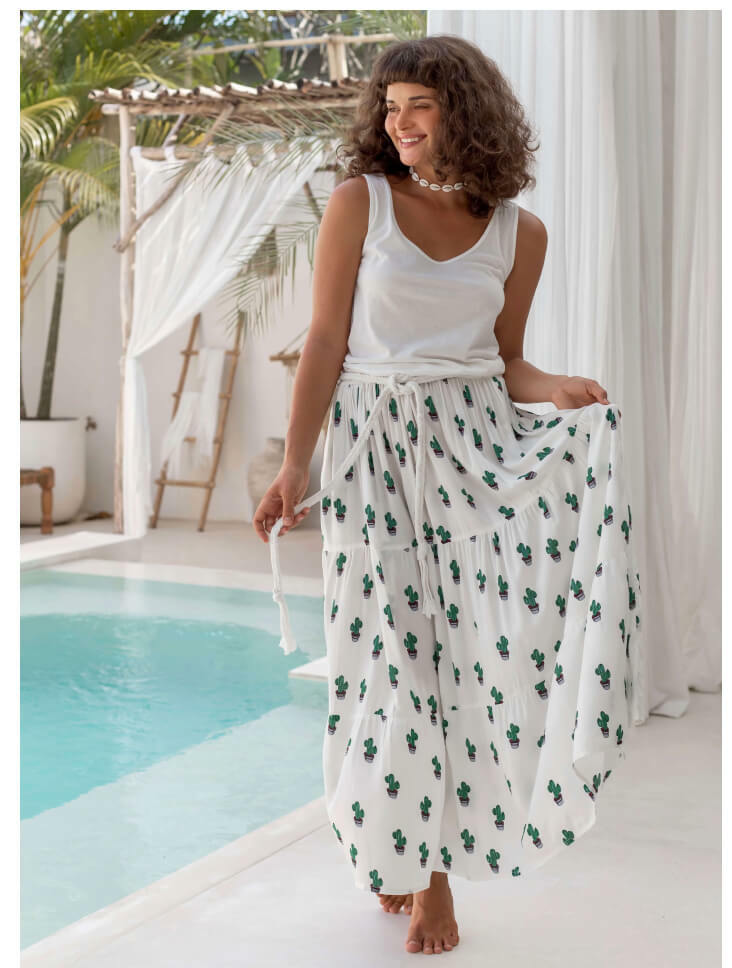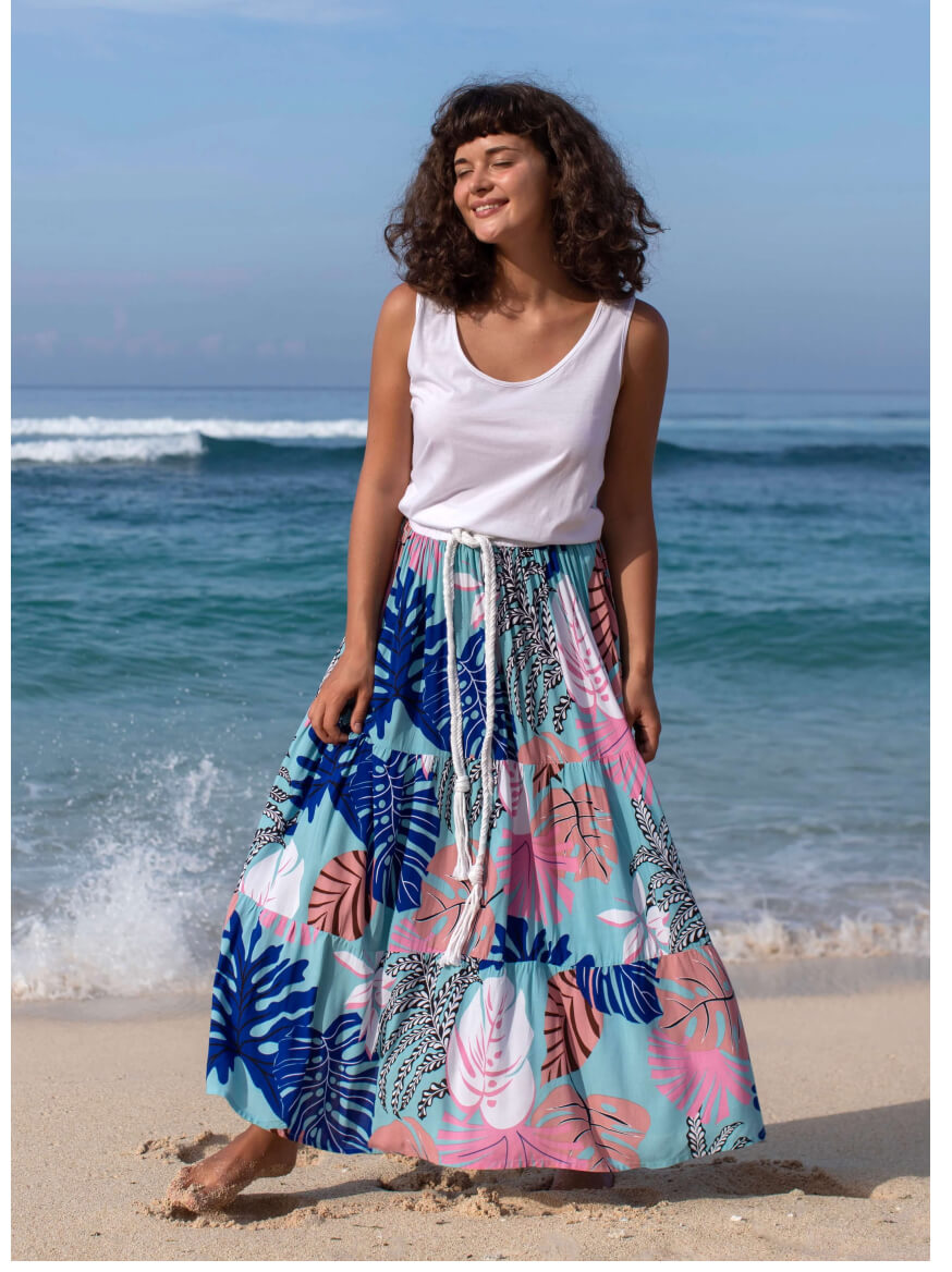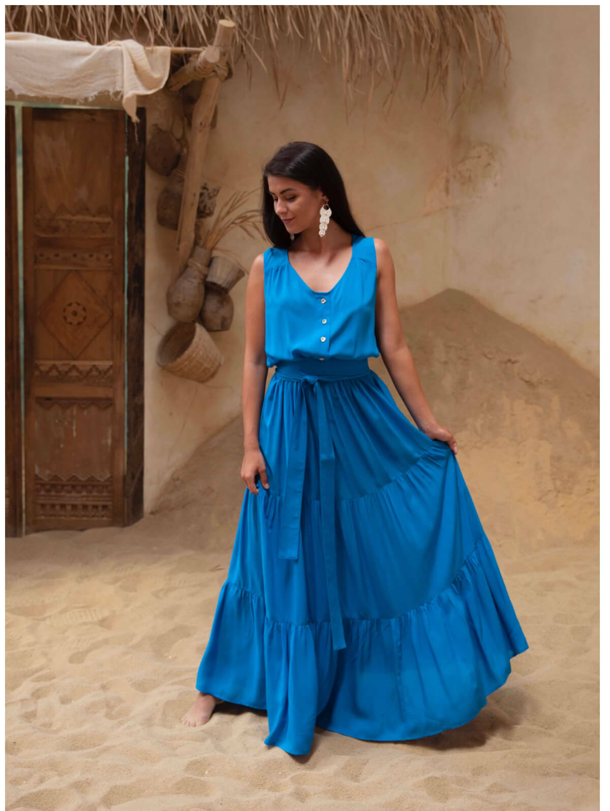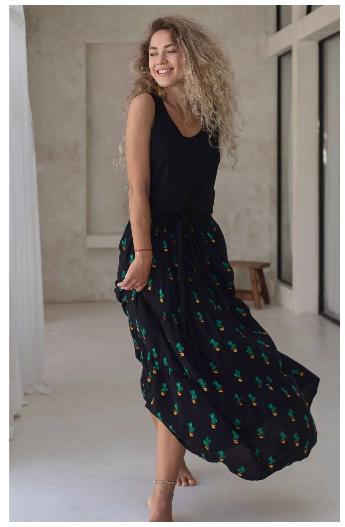 Our most comfortable casual dress. For there is, perhaps, nothing more cozy and practical for the summer than a thin knitted top... and when you don't have to think about what to wear as botton not to get "baked" ... because bright and flowing skirt is inextricably linked with the top, helping to relax not only your body, but also your thoughts.