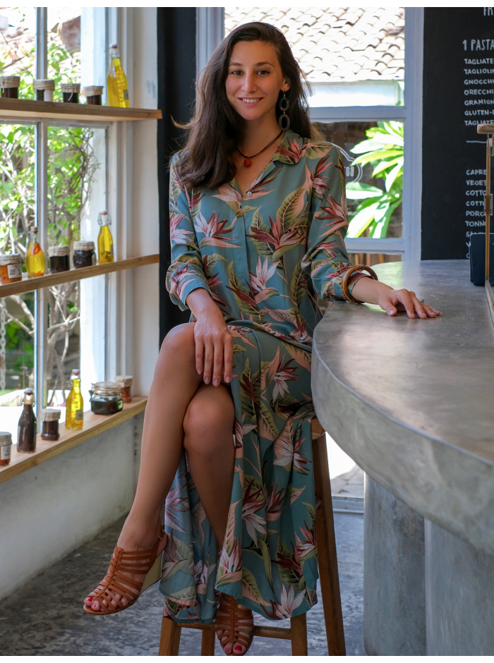 Cette robe possède une ceinture étonnamment longue, d'environ 4 mètres. Et non, ce n'est pas une erreur de coupe! Notre intention était de créer une robe avec une taille bien définie. Une ceinture en viscose de longueur régulière, qui ne permet qu'un seul tour autour de la taille, se transforme rapidement en un spaghetti 5 minutes après l'habillage... Nous avons continué à effectuer des tests sur nous-mêmes... Mais soudain, nous avons trouvé notre inspiration dans la tradition vestimentaire balinaise, qui repose sur l'emballage sans couture des vêtements... Avez-vous déjà une idée de ce que nous avons fait ?... La solution est de faire 3 tours ! La taille est fine et la silhouette est bien définie ! P.S. Eh bien, vous pouvez toujours la couper si vous le souhaitez